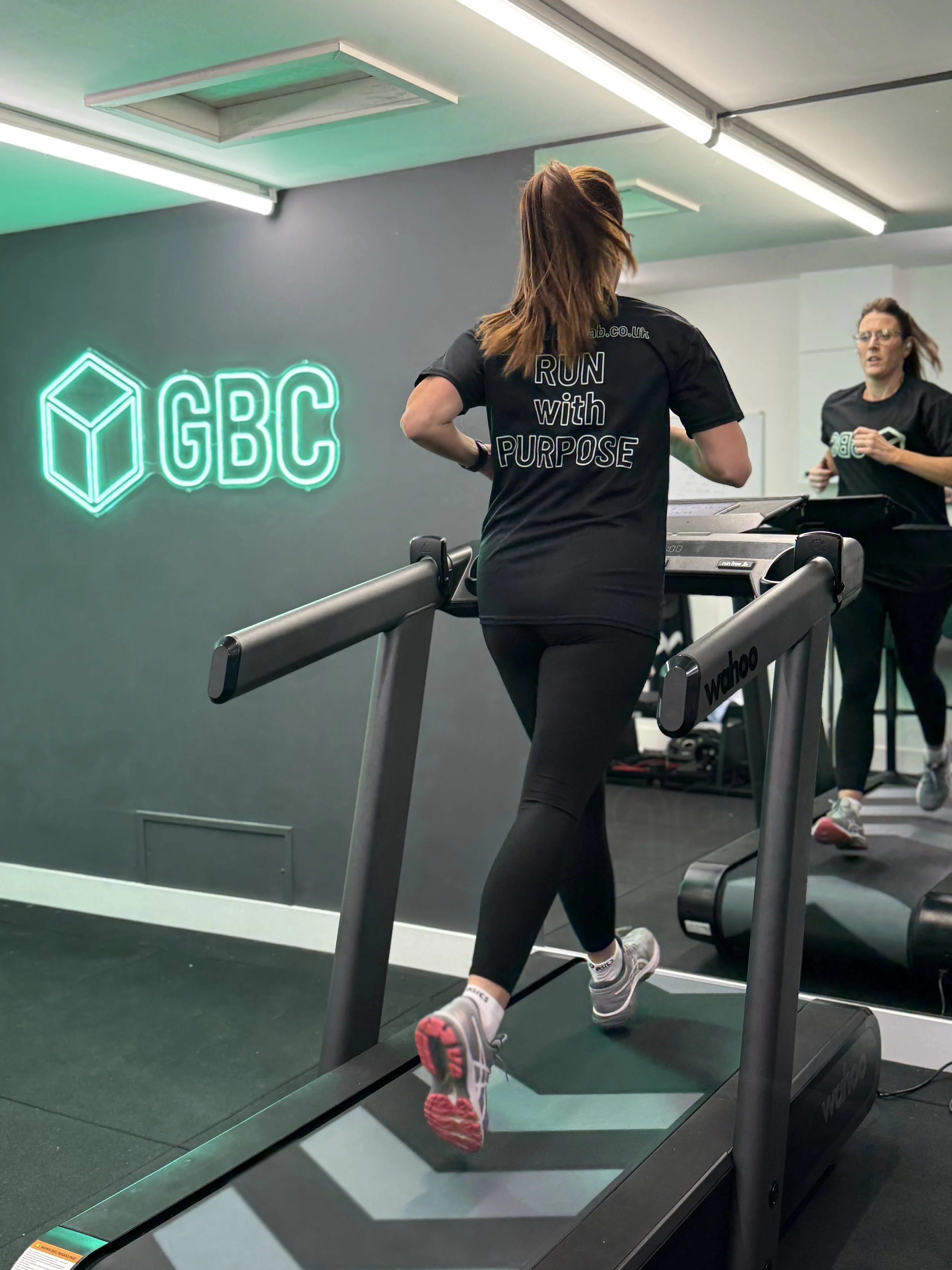 The GBC Run Lab features a Wahoo KICKR Run treadmill, real-time video feedback, mirrors for technique refinement, and a strength zone for mobility and conditioning.